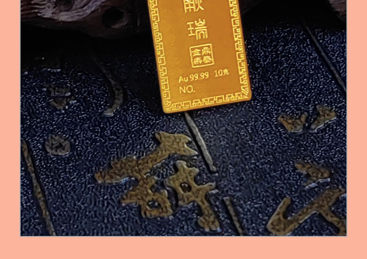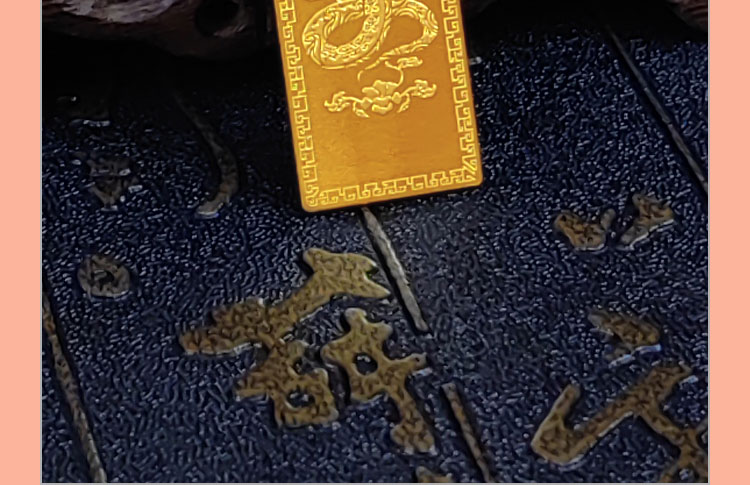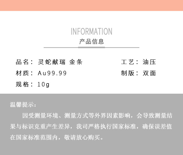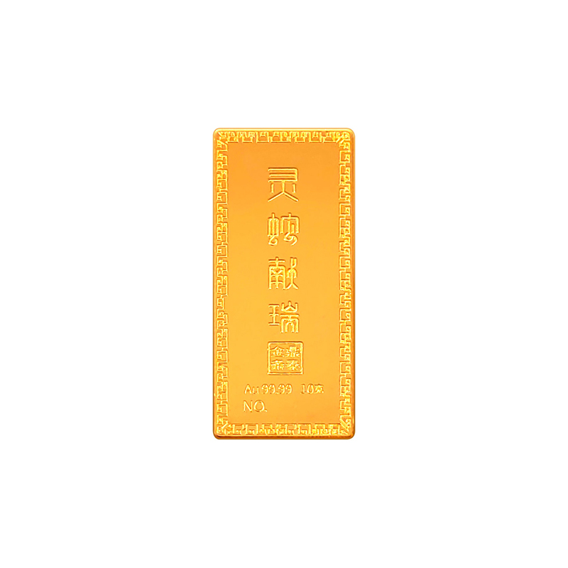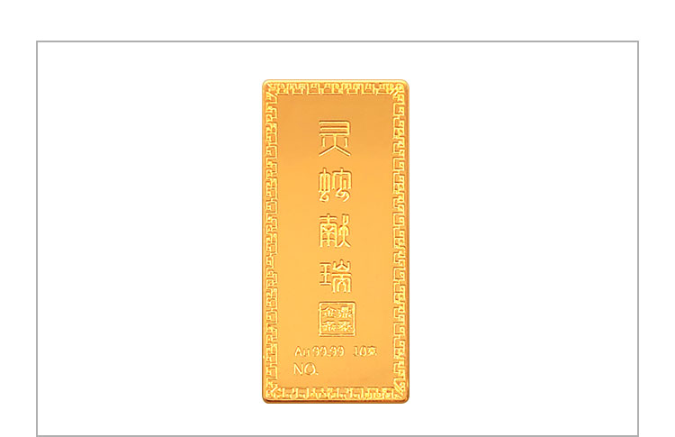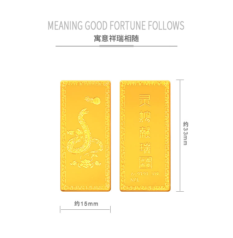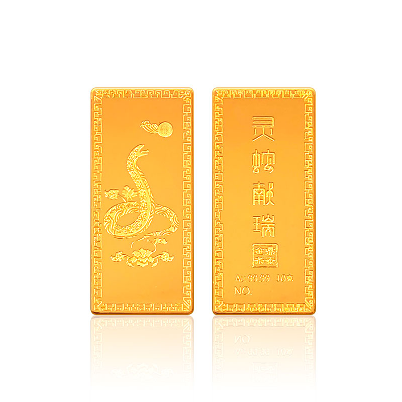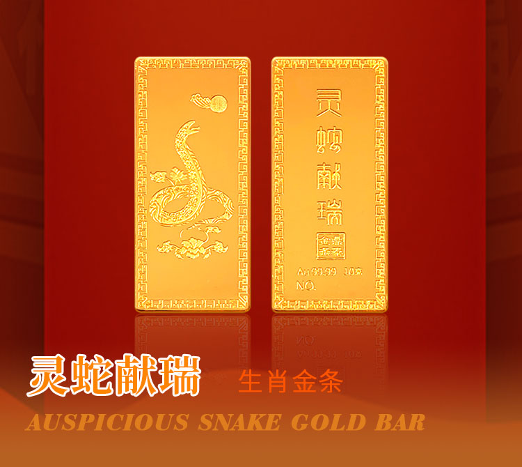 靈蛇獻(xiàn)瑞10克生肖金條,正面為一條盤繞花叢,望月昂首的金蛇造型。金蛇身披圖案為代表神圣的蟠虺紋、明月,代表健康長(zhǎng)壽的東海水和鯨魚紋,代表財(cái)富的金錢樹紋和周圍的牡丹圖案,此謂靈蛇獻(xiàn)瑞主題。整體設(shè)計(jì)寓意增長(zhǎng)學(xué)識(shí)與能力,財(cái)源通達(dá),健康長(zhǎng)壽的美好祝愿。