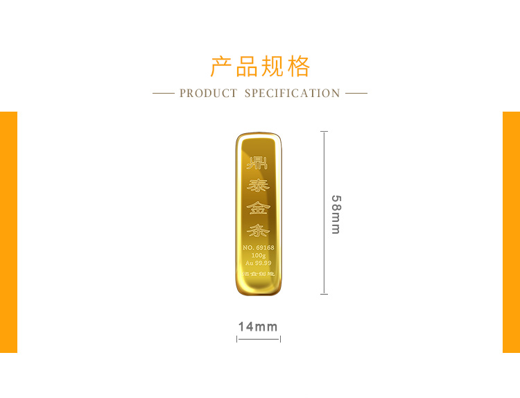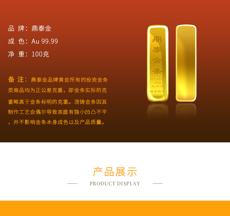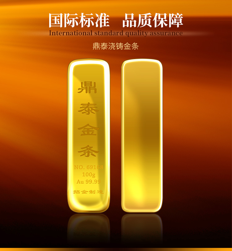 出品品牌為“鼎泰金”,經(jīng)澆鑄工藝制作,外觀圓潤,色度飽滿,全流程嚴(yán)格按照上海黃金交易所標(biāo)準(zhǔn)制造完成,支持購回。金條正面標(biāo)注成色、克重、編號等標(biāo)識。