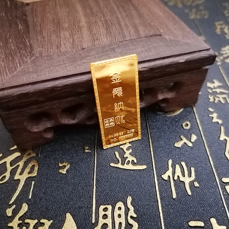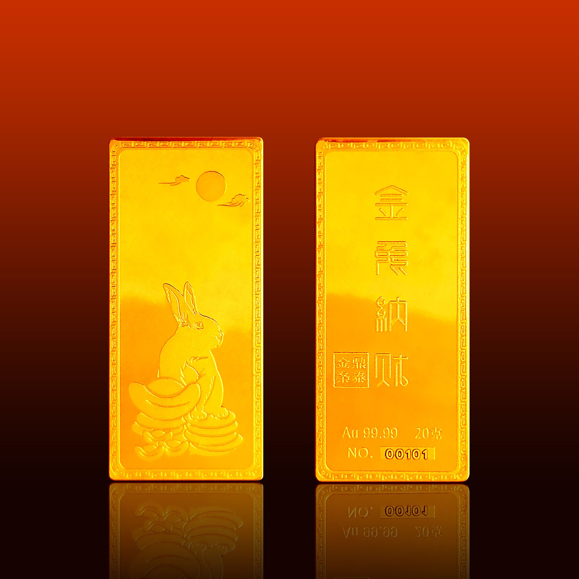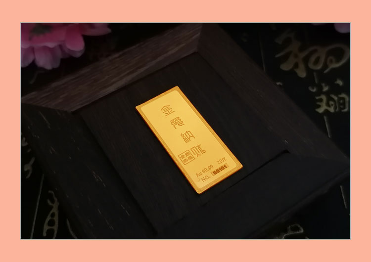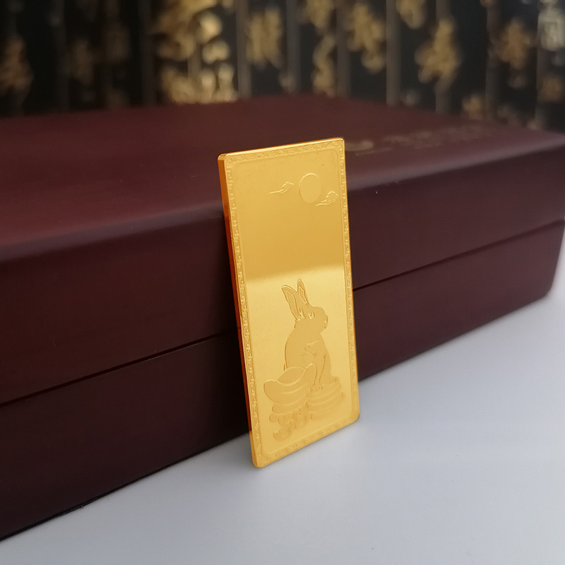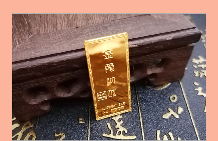 金兔納財(cái)系列金條產(chǎn)品,采用油壓工藝制造。正面圖案為一只兔子蹲坐于金錢(qián)堆上,面前擺放起元寶的造型,兔子形態(tài)機(jī)敏警惕,頭頂有環(huán)繞祥云的明月照耀。反面金兔納財(cái)四字居中,鼎泰金條印章在旁,下方標(biāo)注有金條成色、克重、編號(hào)等。整體設(shè)計(jì)寓意理財(cái)有道,納財(cái)有方,事業(yè)豐順,受福祿而身心靈動(dòng)安康,鴻福綿長(zhǎng)的美好祝愿。金條整體為鏡面底,圖案采用浮雕細(xì)砂工藝,對(duì)比效果清析,十分美觀(guān)。