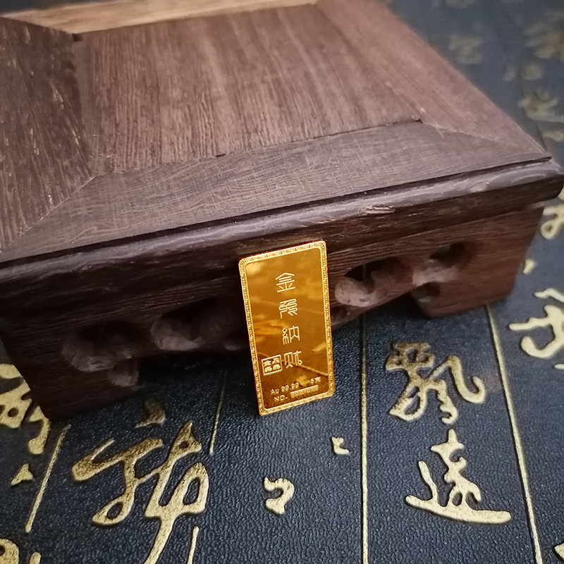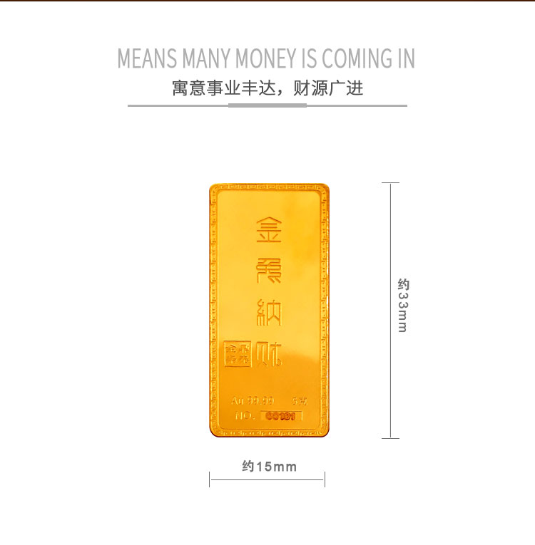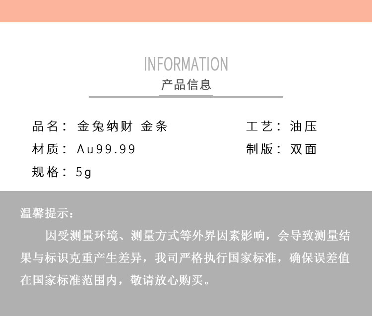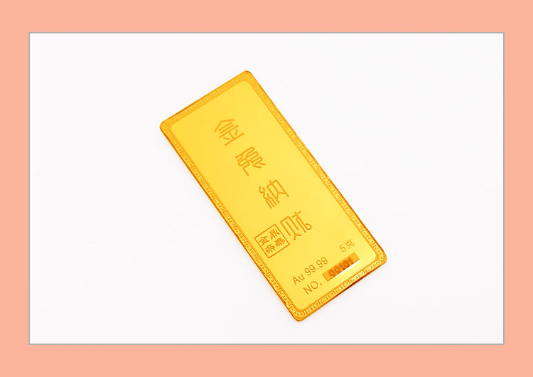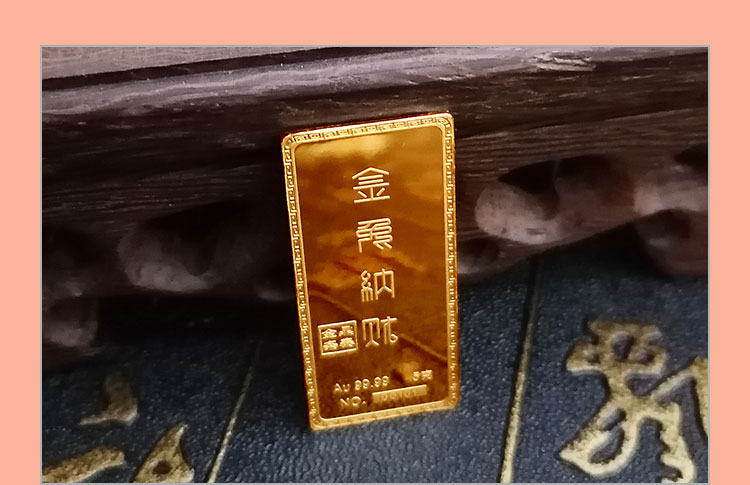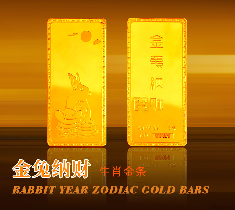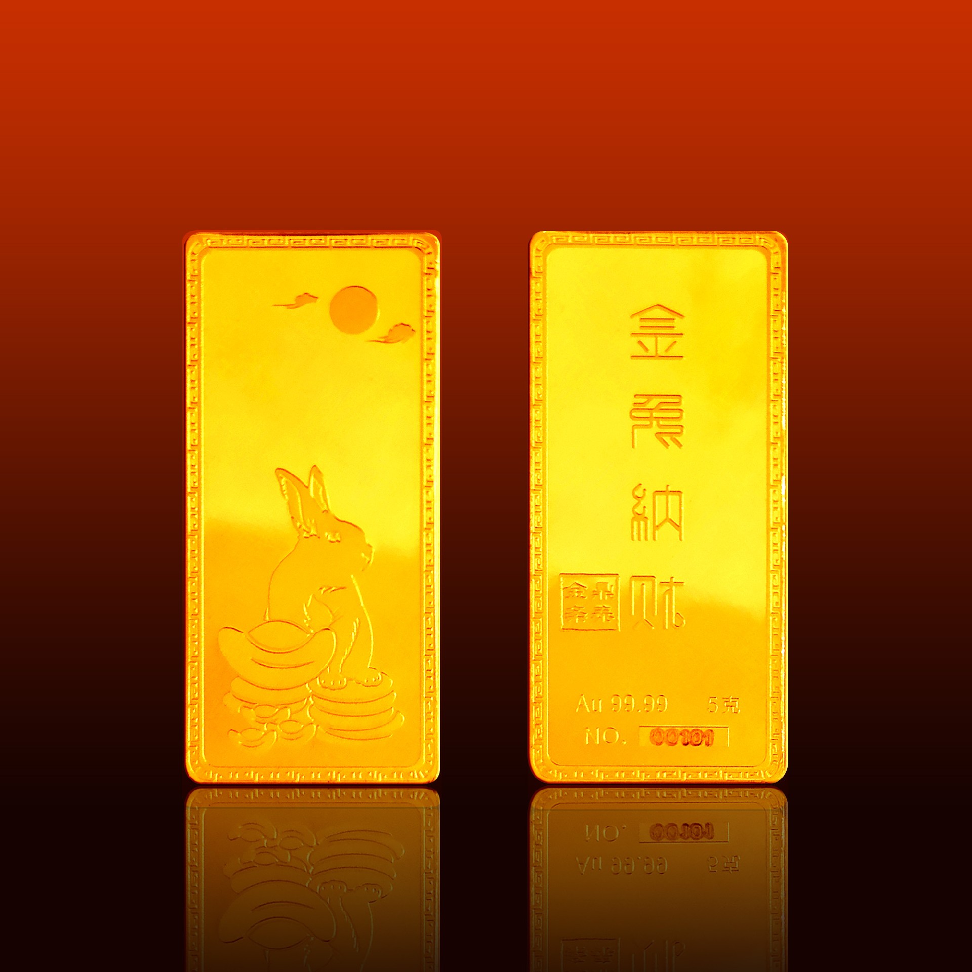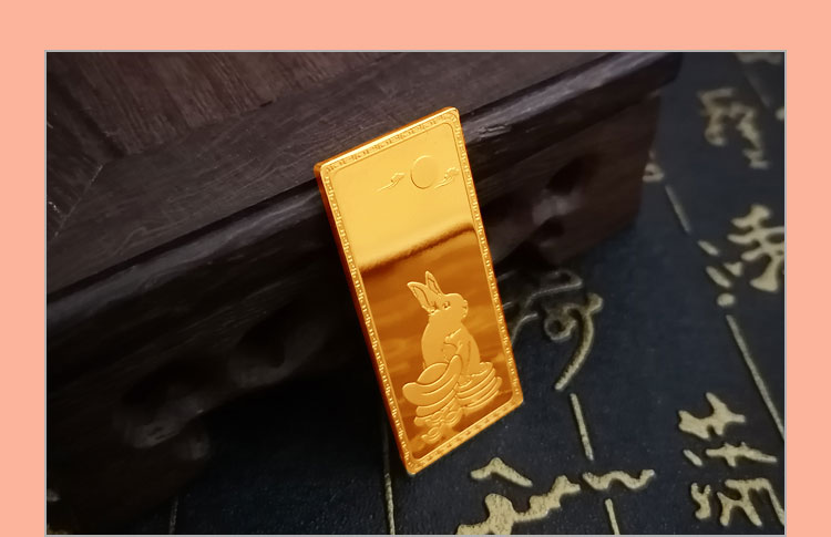 金兔納財系列金條產(chǎn)品,采用油壓工藝制造。正面圖案為一只兔子蹲坐于金錢堆上,面前擺放起元寶的造型,兔子形態(tài)機敏警惕,頭頂有環(huán)繞祥云的明月照耀。反面金兔納財四字居中,鼎泰金條印章在旁,下方標注有金條成色、克重、編號等。整體設計寓意理財有道,納財有方,事業(yè)豐順,受福祿而身心靈動安康,鴻福綿長的美好祝愿。金條整體為鏡面底,圖案采用浮雕細砂工藝,對比效果清析,十分美觀。