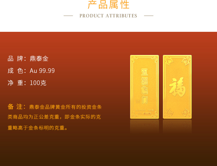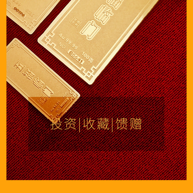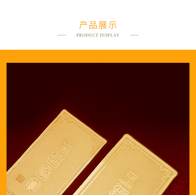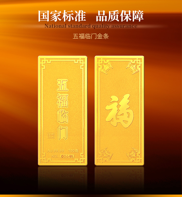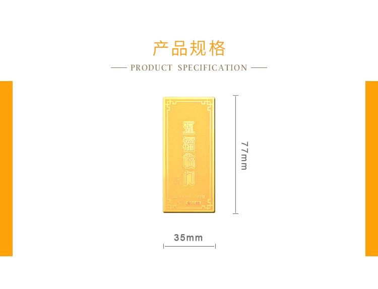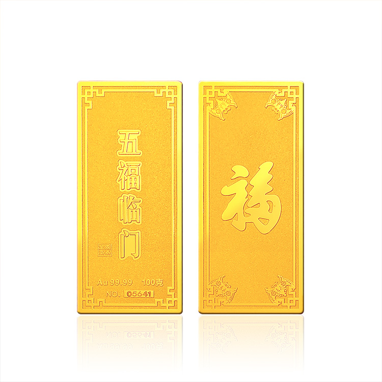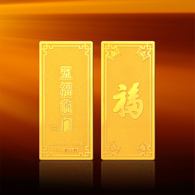 五福臨門(mén)系列金條產(chǎn)品,采用油壓工藝制造。正面圖案以康熙手書(shū)天下第一福的福字為主題,與四周向心蝙蝠(通福)構(gòu)成五福臨門(mén)的美好寓意,反面有五福臨門(mén)文字主題及金條成色,克重,編號(hào)等標(biāo)示。