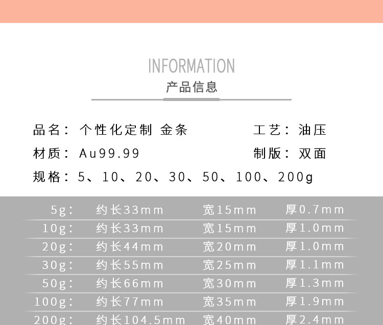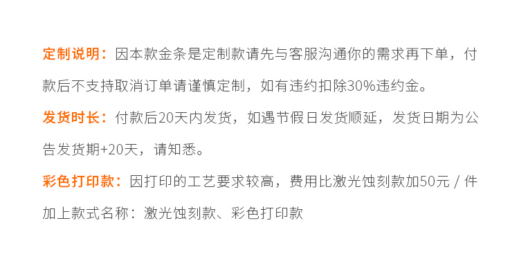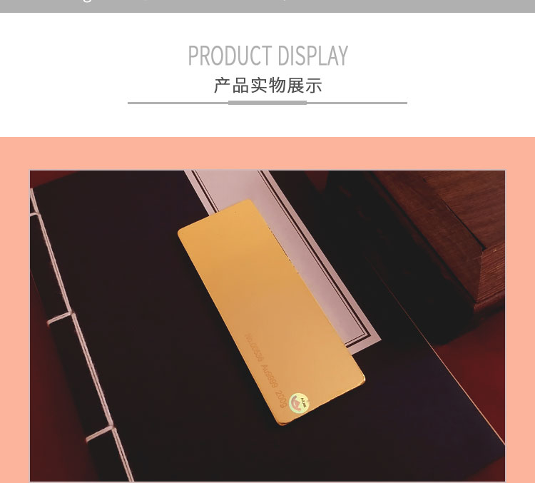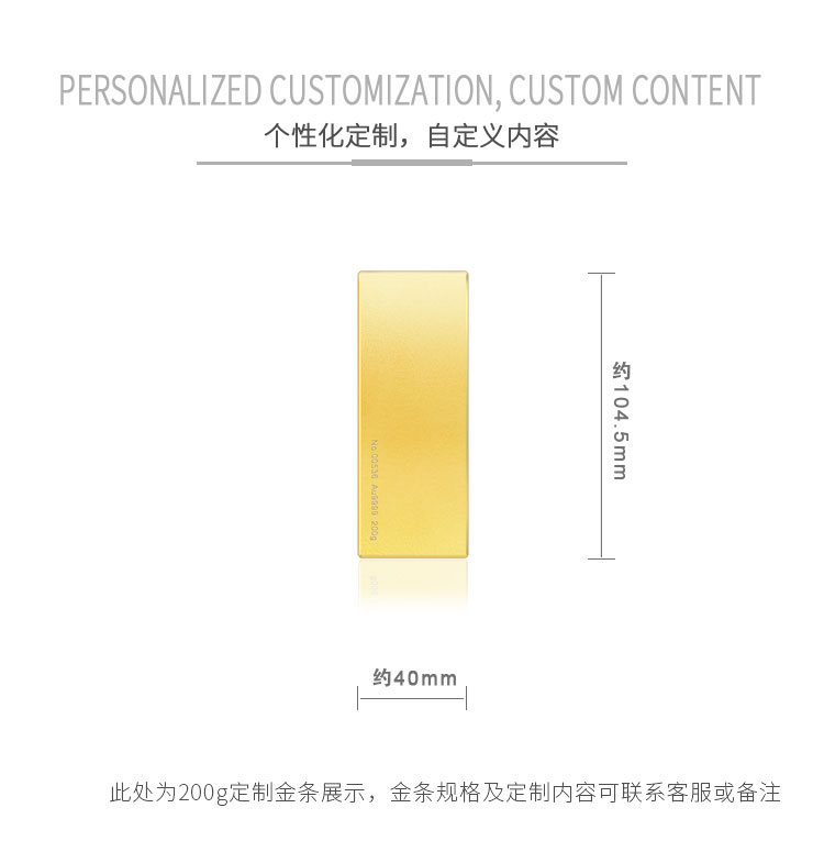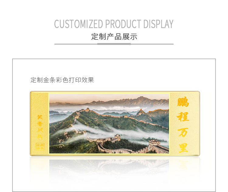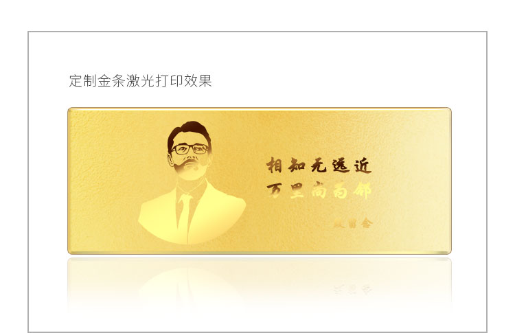 金條可以根據(jù)客戶要求,在金條指定位置處定制激光蝕刻單色圖形或打印彩色圖案??捎糜谥苣陸c典、年終年會、企業(yè)上市、個人定制、喬遷紀念、答謝回饋、員工福利、節(jié)日送禮等,十分適合做為紀念、留念或饋贈禮品,同時兼具投資保值價值。