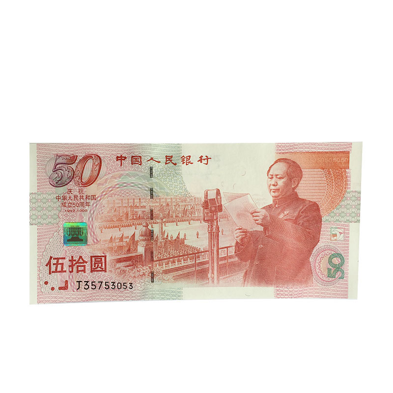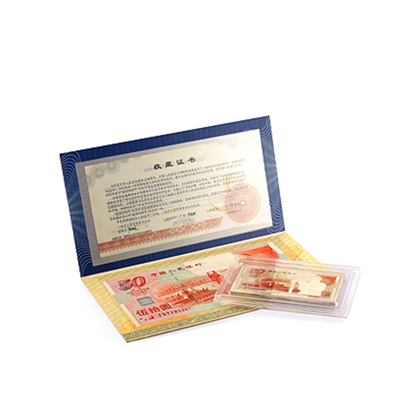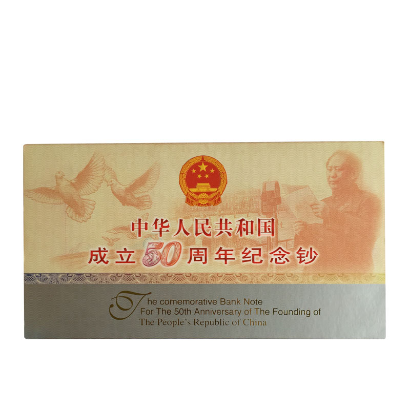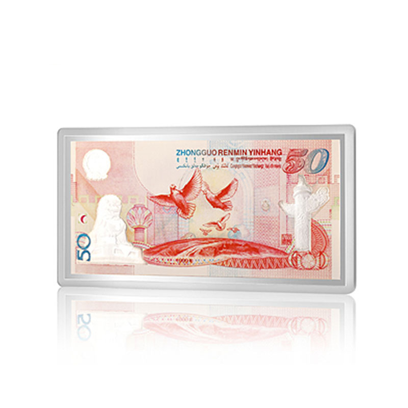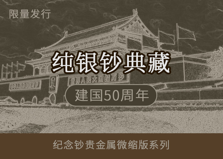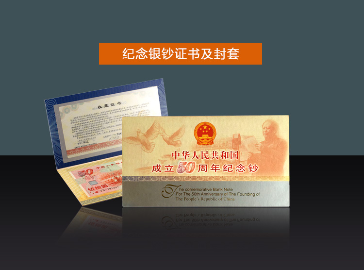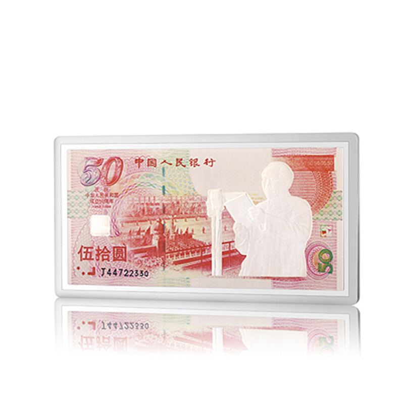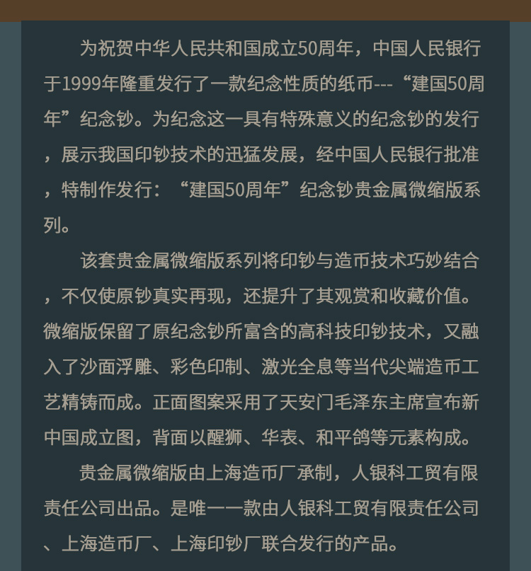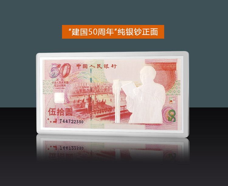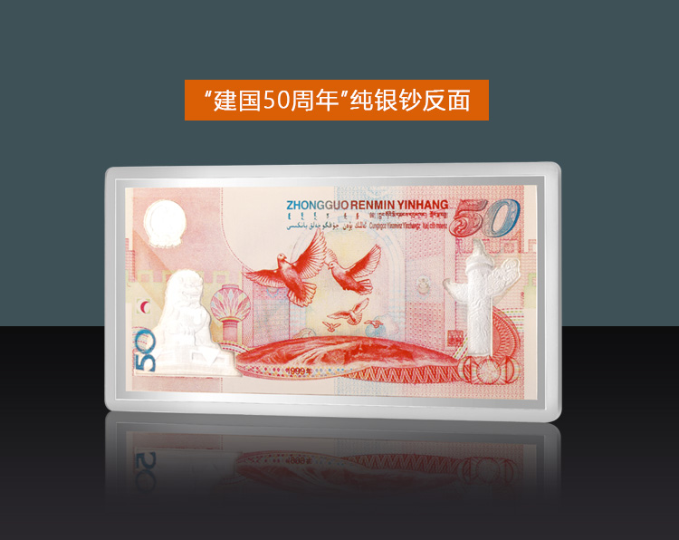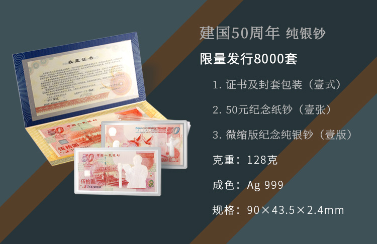 為祝賀中華人民共和國成立50周年,中國人民銀行于1999年隆重發(fā)行了一款紀(jì)念性質(zhì)的紙幣---“建國50周年”紀(jì)念鈔。為紀(jì)念這一具有特殊意義的紀(jì)念鈔的發(fā)行,展示我國印鈔技術(shù)的迅猛發(fā)展,經(jīng)中國人民銀行批準(zhǔn),特制作發(fā)行:“建國50周年”紀(jì)念鈔貴金屬微縮版系列。該套貴金屬微縮版系列將印鈔與造幣技術(shù)巧妙結(jié)合,不僅使原鈔真實(shí)再現(xiàn),還提升了其觀賞和收藏價值。微縮版保留了原紀(jì)念鈔所富含的高科技印鈔技術(shù),又融入了沙面浮雕、彩色印制、激光全息等當(dāng)代尖端造幣工藝精鑄而成。該貴金屬微縮純金版,含99.9%純金198克,限量發(fā)行1000套;銀鑲金版含99.9%純金18克,含99.9%純銀128克.限量發(fā)行3000套;純銀版含99.9%純銀128克,限量發(fā)行8000套。每套隨附編號收藏證書及“建國50周年”紀(jì)念鈔一張。貴金屬微縮版由上海造幣廠承制,人銀科工貿(mào)有限責(zé)任公司出品。是唯一一款由人銀科工貿(mào)有限責(zé)任公司、上海造幣廠、上海印鈔廠聯(lián)合發(fā)行的產(chǎn)品。產(chǎn)品極具收藏觀賞價值。