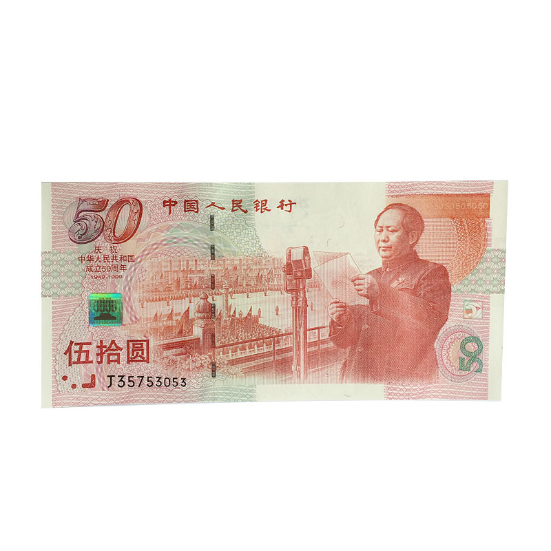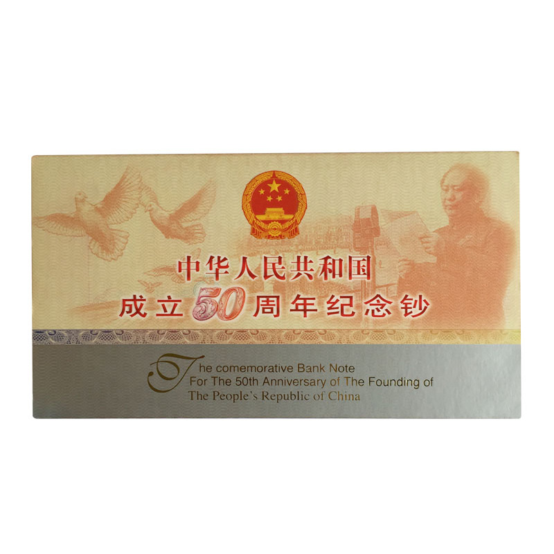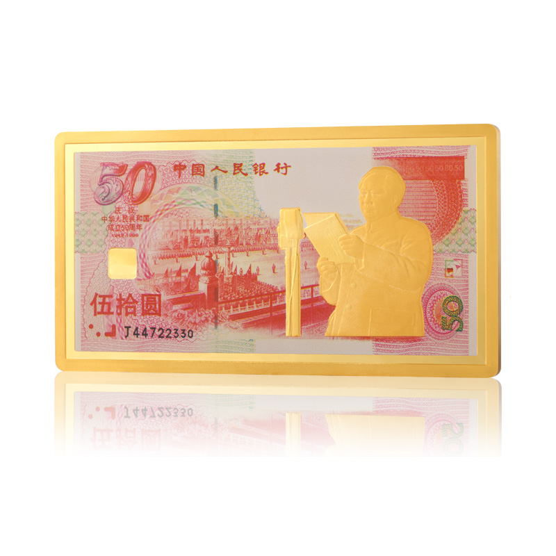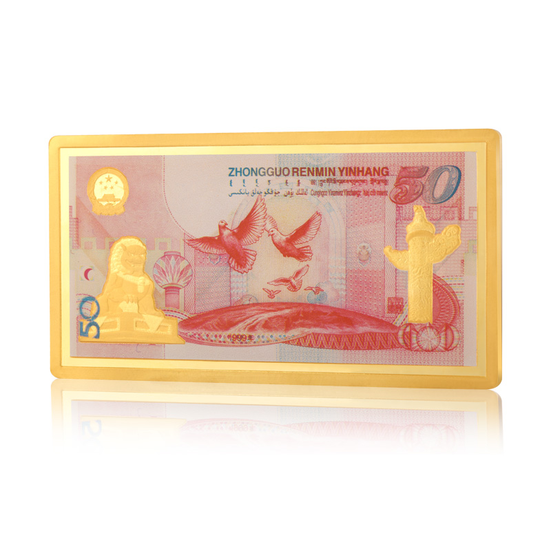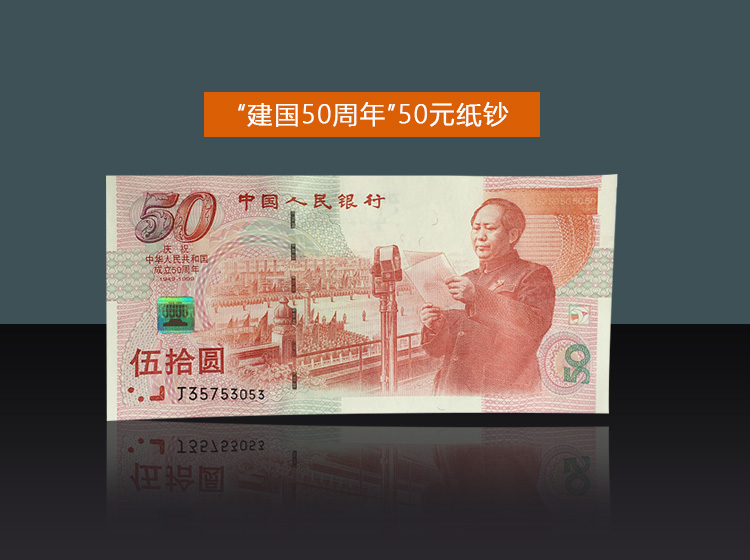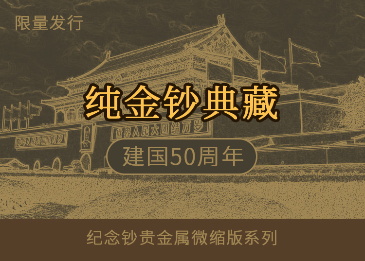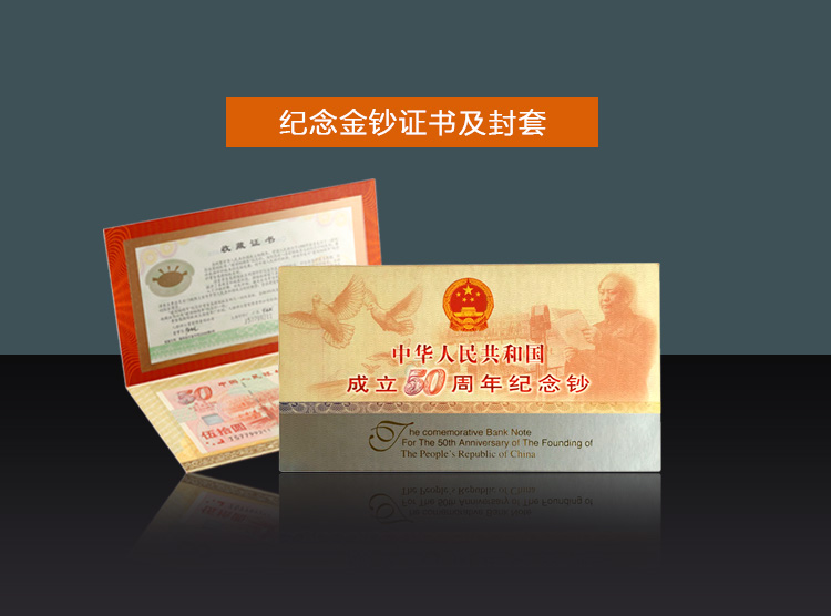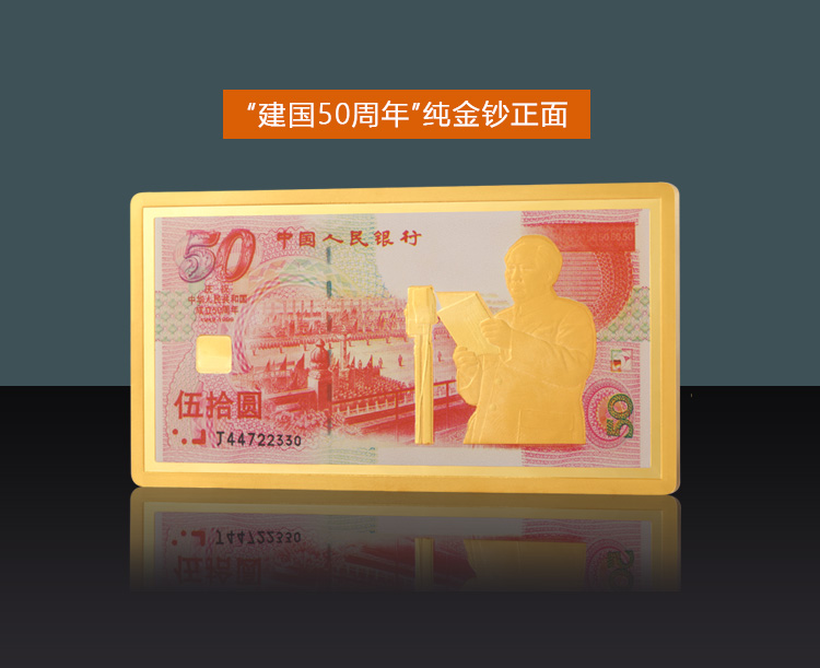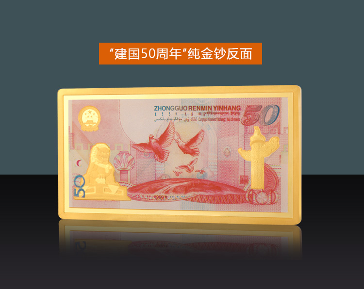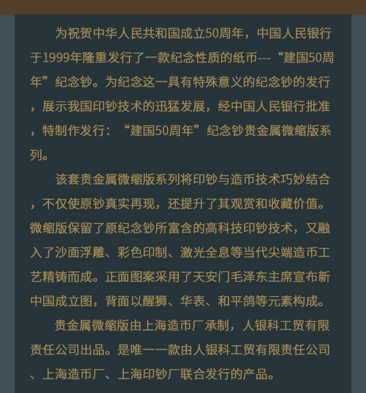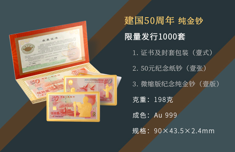 為祝賀中華人民共和國成立50周年,中國人民銀行于1999年隆重發(fā)行了一款紀念性質(zhì)的紙幣---“建國50周年”紀念鈔。為紀念這一具有特殊意義的紀念鈔的發(fā)行,展示我國印鈔技術(shù)的迅猛發(fā)展,經(jīng)中國人民銀行批準,特制作發(fā)行:“建國50周年”紀念鈔貴金屬微縮版系列。該套貴金屬微縮版系列將印鈔與造幣技術(shù)巧妙結(jié)合,不僅使原鈔真實再現(xiàn),還提升了其觀賞和收藏價值。微縮版保留了原紀念鈔所富含的高科技印鈔技術(shù),又融入了沙面浮雕、彩色印制、激光全息等當代尖端造幣工藝精鑄而成。該貴金屬微縮純金版,含99.9%純金198克,限量發(fā)行1000套;銀鑲金版含99.9%純金18克,含99.9%純銀128克.限量發(fā)行3000套;純銀版含99.9%純銀128克,限量發(fā)行8000套。每套隨附編號收藏證書及“建國50周年”紀念鈔一張。貴金屬微縮版由上海造幣廠承制,人銀科工貿(mào)有限責(zé)任公司出品。是唯一一款由人銀科工貿(mào)有限責(zé)任公司、上海造幣廠、上海印鈔廠聯(lián)合發(fā)行的產(chǎn)品。產(chǎn)品極具收藏觀賞價值。